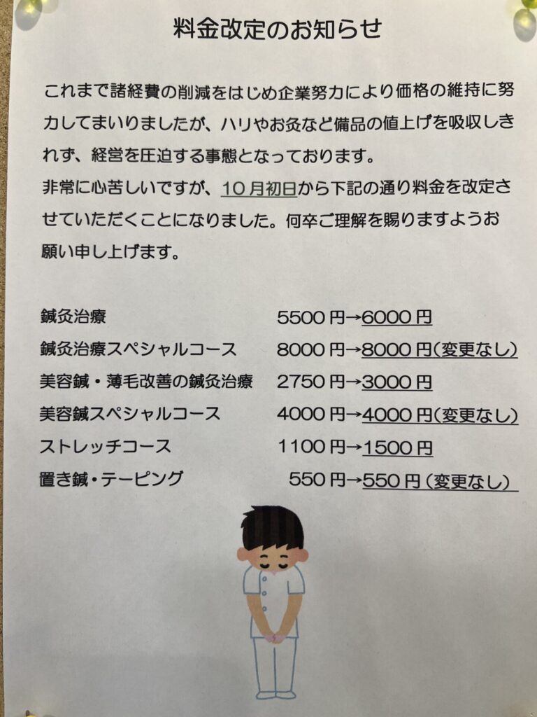 これまで諸経費の削減をはじめ企業努力により価格の維持に努力してまいりましたが、ハリやお灸など備品の値上げを吸収しきれず、経営を圧迫する事態となっております。